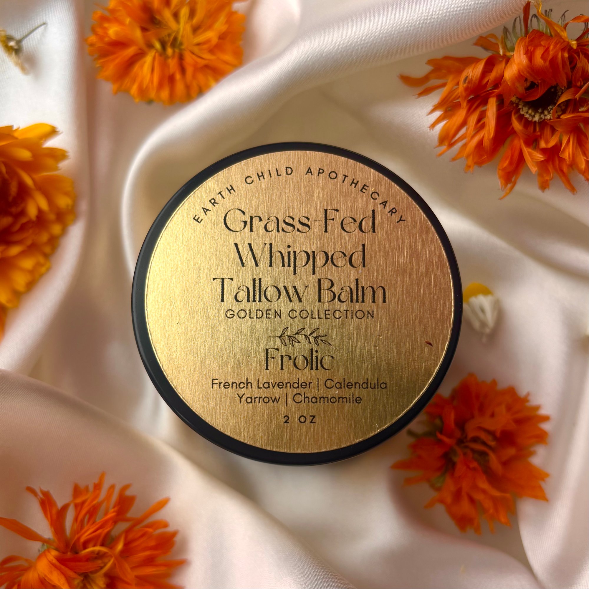 Our very special and limited edition scent, Frolic, contains French Lavender, Calendula, Chamomile, and Yarrow from our organic gardens. All slow infused into our premium jojoba oil and sea buckthorn berry oil blend. Then carefully whipped into this luxury tallow balm.